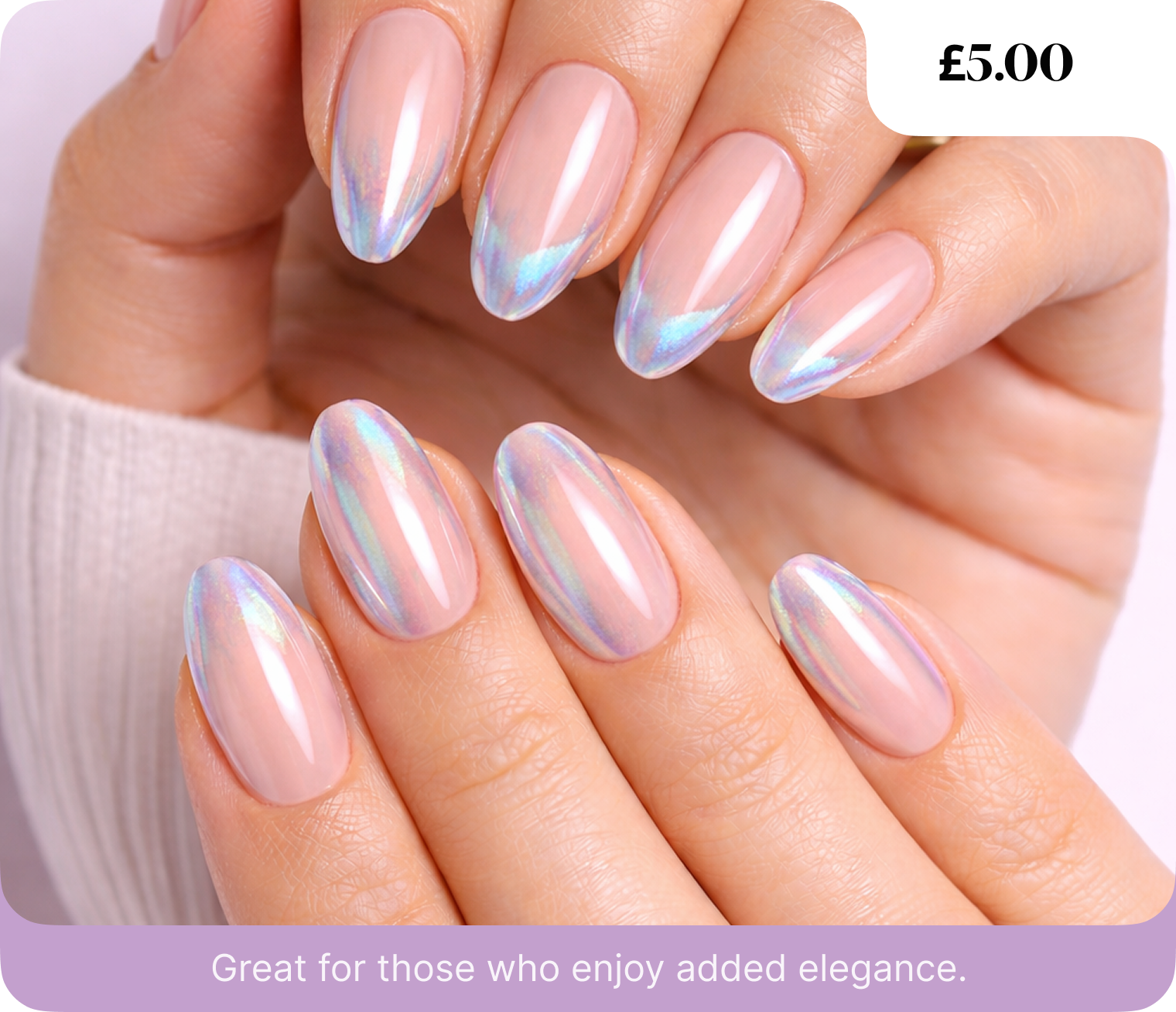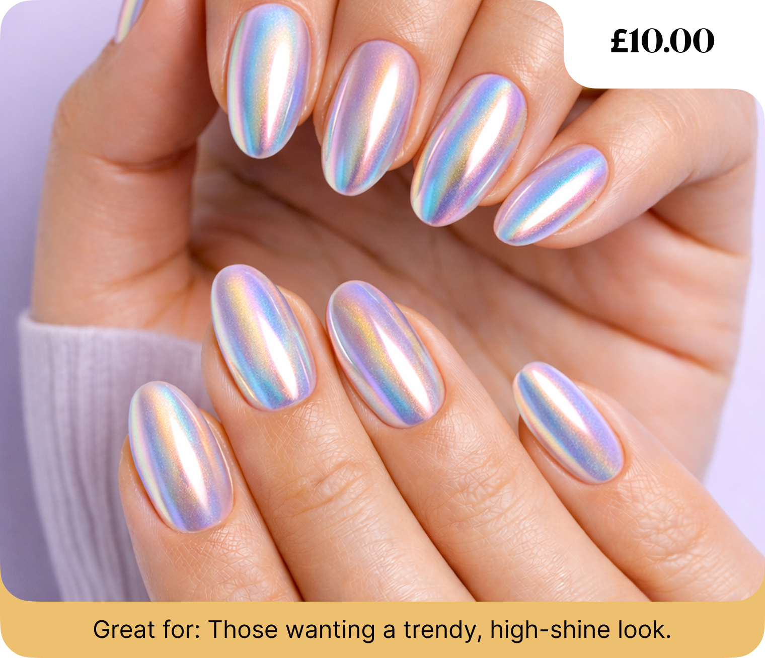 Shine bright with our chrome or holographic nails that give your nails a futuristic, reflective finish.